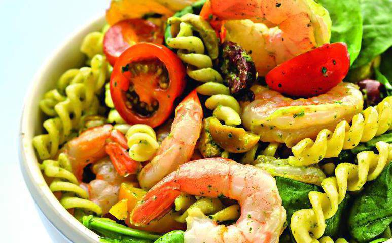 7. Высыпьте макароны, креветки, помидоры, перец, шпинат и оливки с маслинами в миску, полейте подготовленной заправкой, хорошо перемешайте и подавайте к столу.