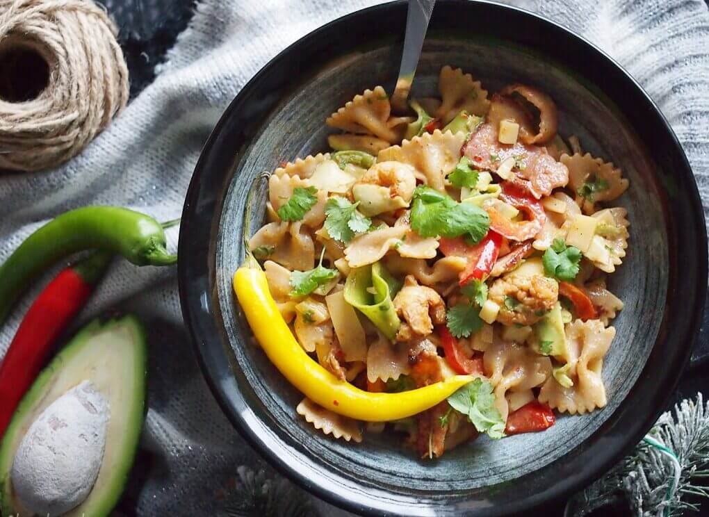Предлагаем рецепт пикантного салата из макарон с креветками, который пользуется популярностью на любой вечеринке. Макароны в форме бантиков отлично сочетаются с креветками, поджаренными со специями, хрустящим беконом и сладким перцем, сыром и авокадо. Острая заправка аппетитно оттеняет вкус салата.