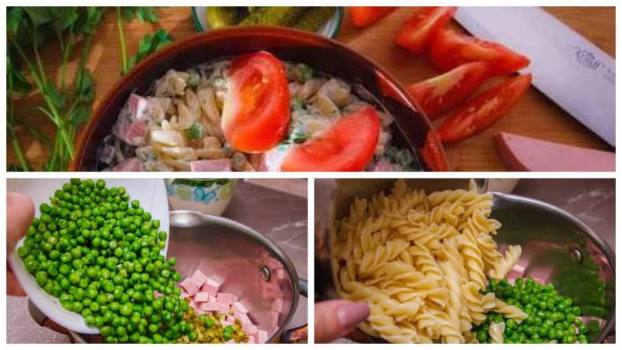 Готовим салат из макарон фузилли с зеленым горошком и колбасой