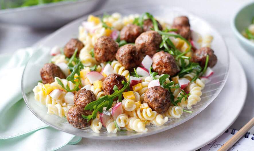 7. Салат приправьте по вкусу, выложите в салатник, дополните рукколой, уложите сверху фрикадельки. Салат из макарон с фрикадельками готов к подаче на стол.