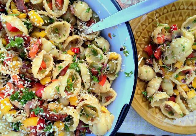 Готовим салат с макаронами, копченым беконом и кунжутом