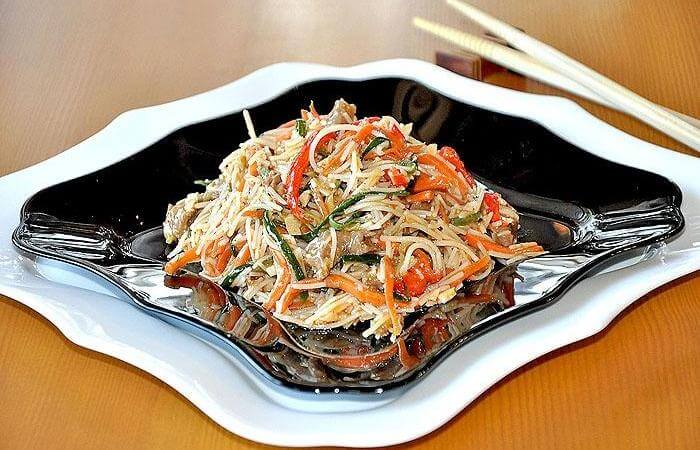 Рисова локшина – невід'ємний інгредієнт азіатської кухні. Просто обожнювали її ще японські самураї. По-китайськи назва рисової локшини звучить як «фунчоза». Пропонуємо до вашої уваги оригінальний рецепт ситного та поживного, і водночас легкого й смачного салату з рисовою локшиною, овочами та м'ясом.