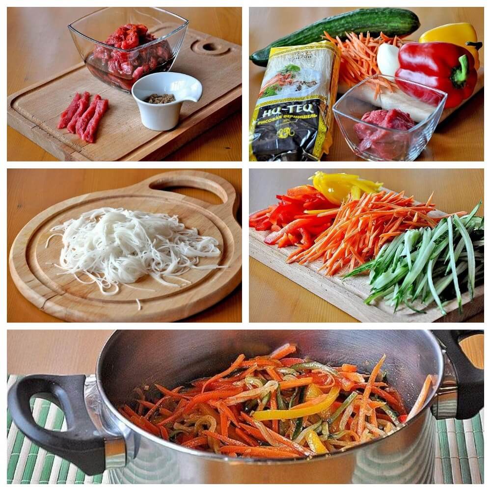 Готуємо салат з рисовою локшиною, овочами та м'ясом.