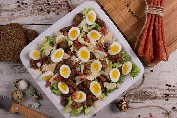 Готовим салат из перепелиных яиц с колбасой, сыром и сухариками