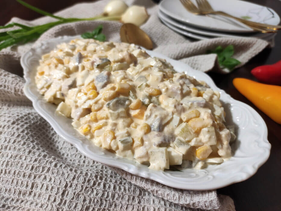 Апетитний яєчний салат з оселедцем пропонуємо приготувати з додаванням консервованої кукурудзи, маринованих огірків і ріпчастої цибулі, а для заправки ідеально підійде майонез, змішаний з сметаною, вершками чи натуральним йогуртом. Якщо оселедці солоні (цілі тушки чи філе), то вони потребують попереднього вимочування протягом кількох годин. Цей простий у приготуванні салат підходить як для щоденного приготування, так і для святкового столу до зимових новорічних свят. Найкраще салат смакує наступного дня, тож приготуйте його заздалегідь і поставте настоюватись у холодильник.