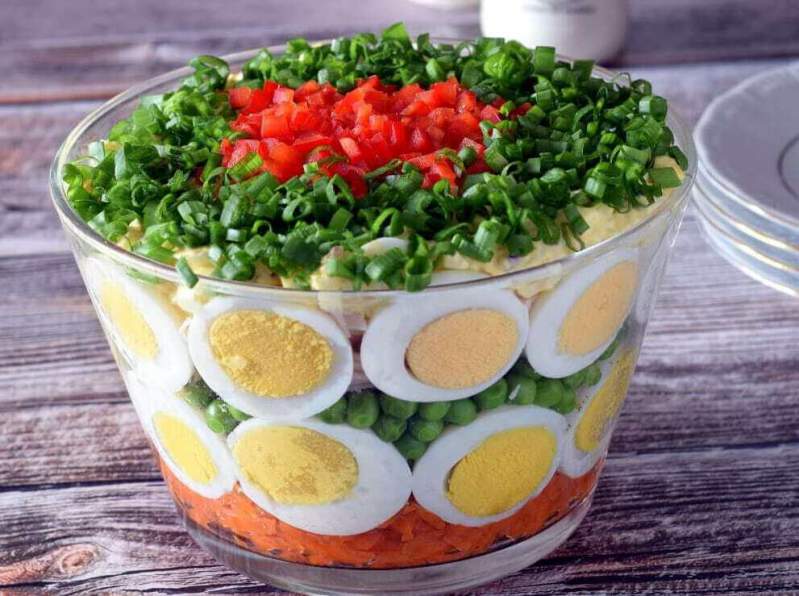5.На слой моркови уложите отваренный и остывший зеленый горошек. По кругу расположите на зеленом горошке оставшиеся кружки яиц (прижимая к стенкам салатника).