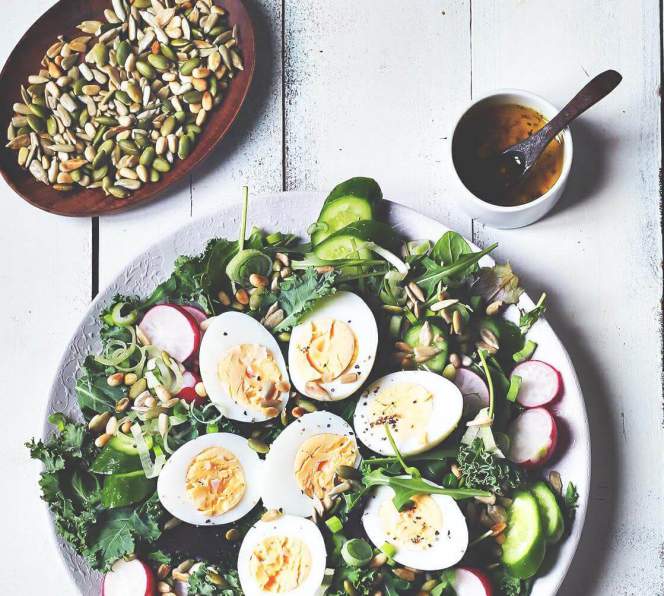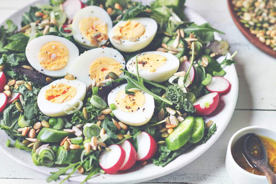 В качестве зеленого компонента отлично подойдет салатный микс, содержащий рукколу, шпинат, полевой салат. Впрочем, предоставим вам выбирать зеленый букет самостоятельно. Яйца в главной роли отлично дополняет редис, огурцы и зеленый лук. А зерна семян и орешков обогащают салат растительным белком. Заправочный соус винегрет придаст блюду завершающий пряный акцент.