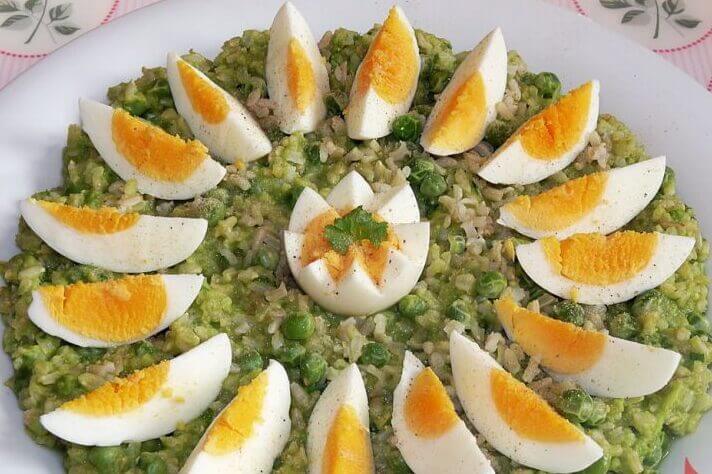 Салат из яиц с рисом и соусом авокадо предлагаем приготовить с добавлением зеленого горошка и листьев свежего базилика.