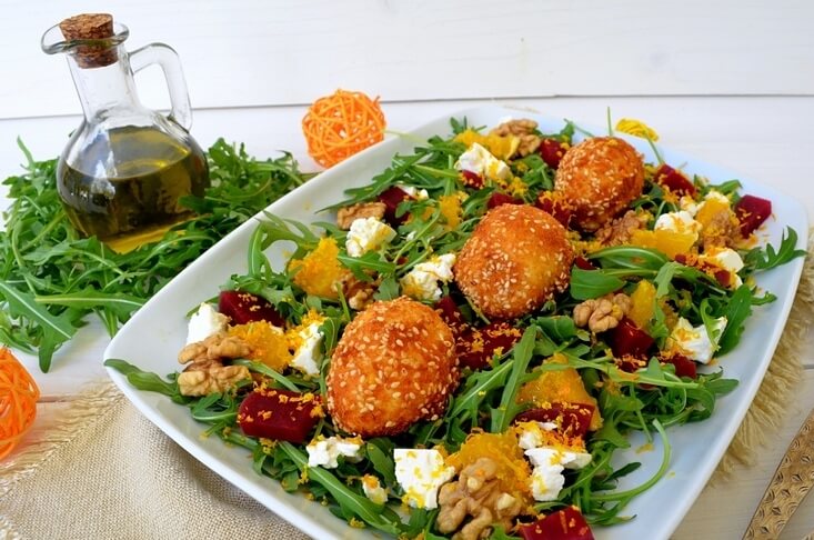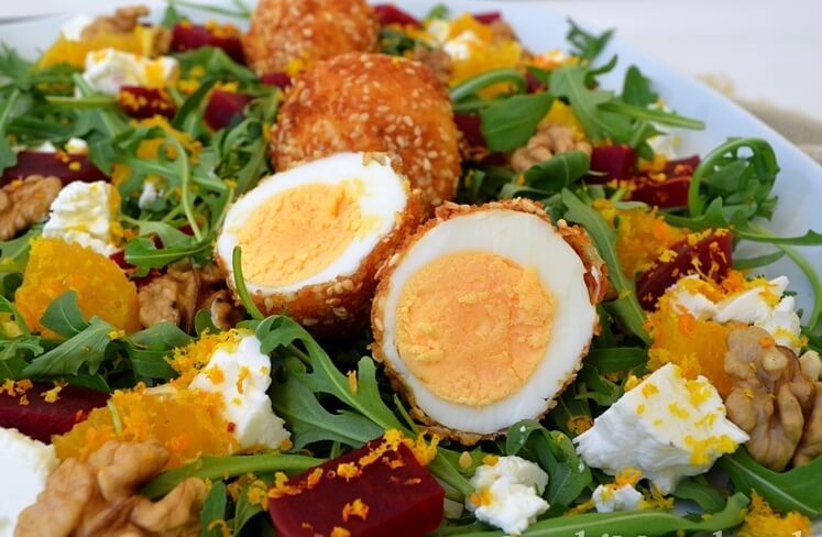Салат с панированными яйцами, свёклой и рукколой готовится довольно быстро при условии, что вы испекли свёклу заранее. Конечно, можно отварить свёклу и в воде, но в запеченном виде она намного вкуснее ощущается в салате. Добавление апельсина намного освежает вкусовую комбинацию, а панированные яйца придают ему изысканный шарм.