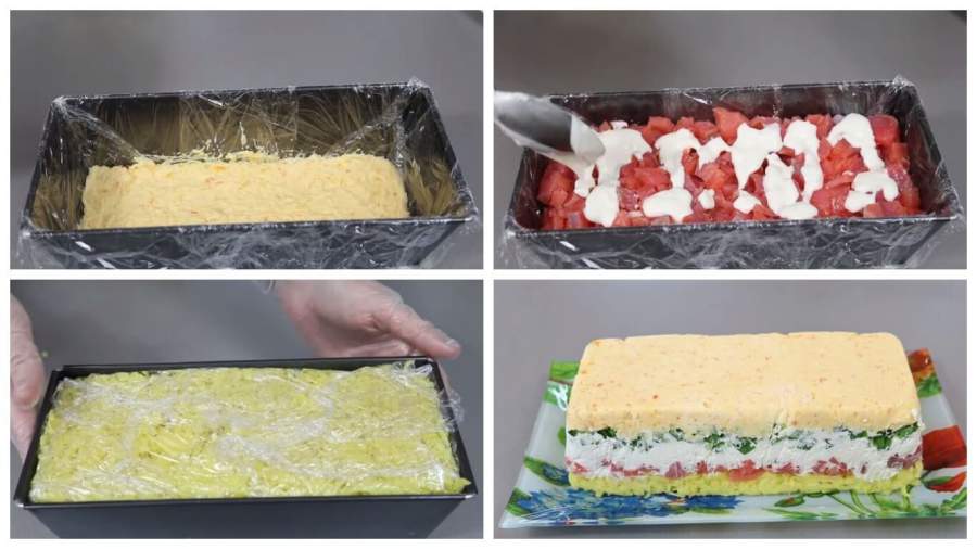 9.По истечении указанного времени достаньте форму из холодильника, разверните края пищевой пленки. Накройте форму овальным или прямоугольным блюдом подходящего размера и осторожно переверните на него салат.