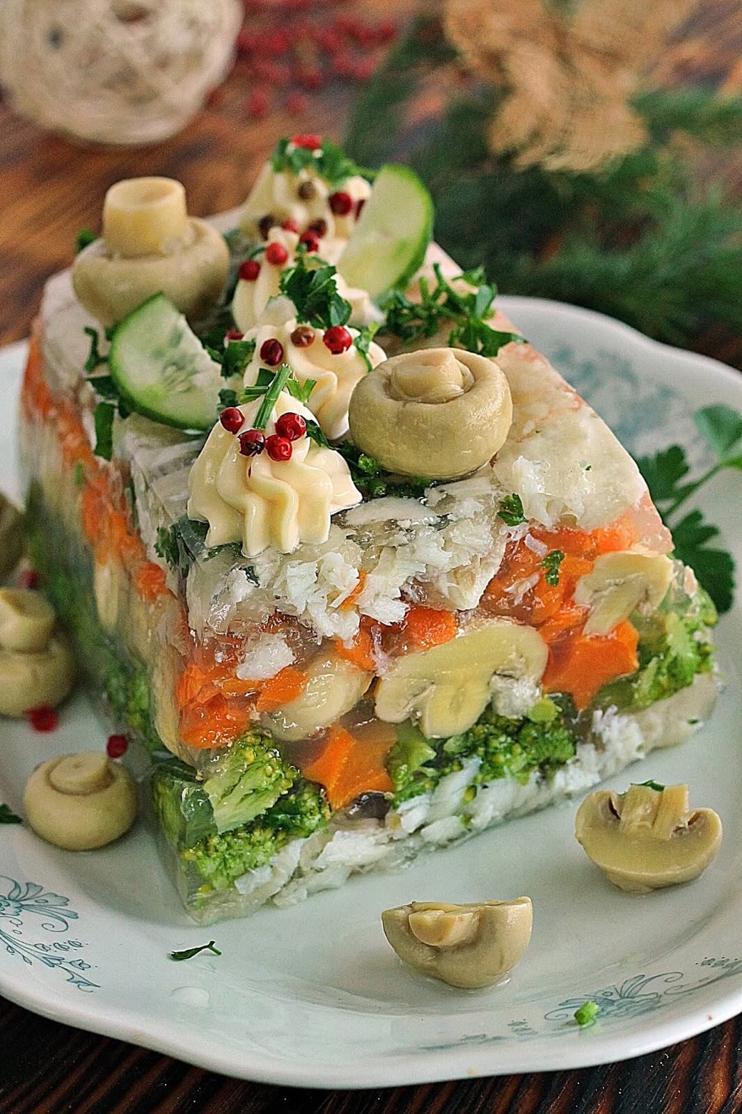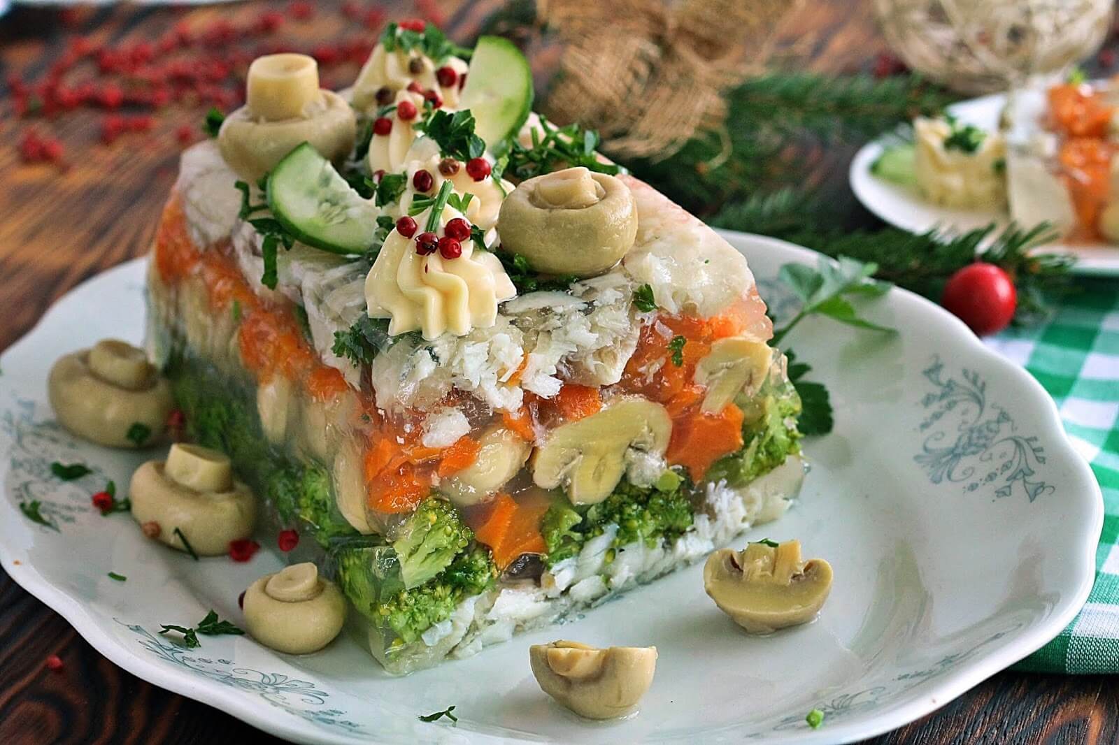 Если вы желаете удивить гостей новым, красиво поданным блюдом, обратите внимание на рецепт желейного салата с треской и грибами. Легкий салат с рыбой и множеством овощей под морковными звездами отлично подойдет для праздничного стола. Его оценят те гости, которые заботятся об изяществе своей талии.