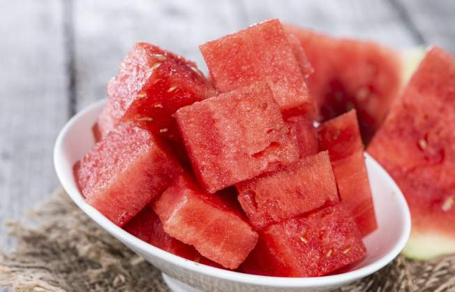 2. Спелый, но не переспевший арбуз нарежьте кубиками, попутно удаляя косточки.