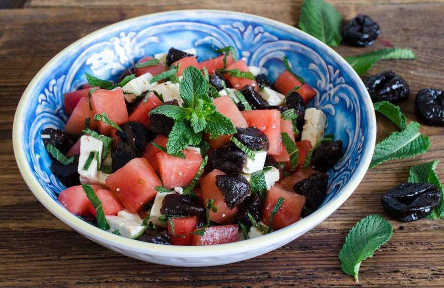 Мякоть арбуза в сочетании с сыром и мятой может показаться необычной на вкус. Но в Северной Африке салаты в таком сочетании употребляются почти ежедневно, как простая освежающая и охлаждающая еда.