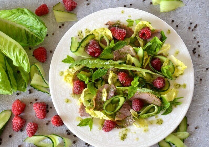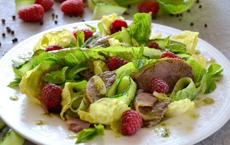 Салат из малины с печеным гусиным мясом и мятным соусом