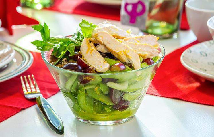 7. Выложите на салатное блюдо виноградную смесь, а сверху разложите кусочки куриного филе. Снимите листочки эстрагона с веток и украсьте ими салат. Салат из винограда с курицей и сельдереем готов к подаче.
