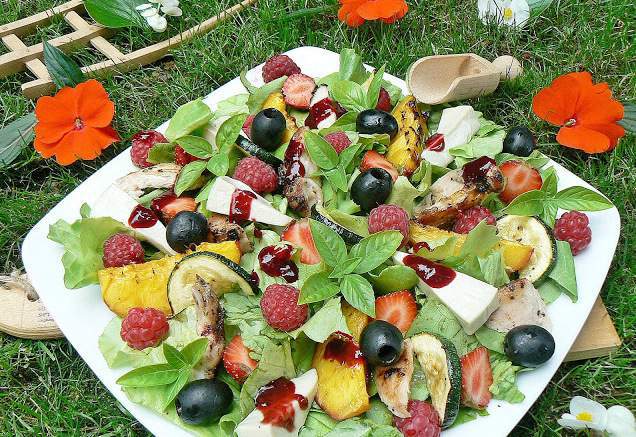 3. На тарелку или плоское блюдо разложите вымытые и порванные на крупные куски листья салата, а на него – разрезанные вдоль на 2-4 части ягоды клубники, малину (1/3 часть, самые красивые ягоды), поджаренные на гриле дольки нектаринов, кусочки плавленого голубого сыра, кусочки курицы и кружки кабачков, поджаренные на гриле.