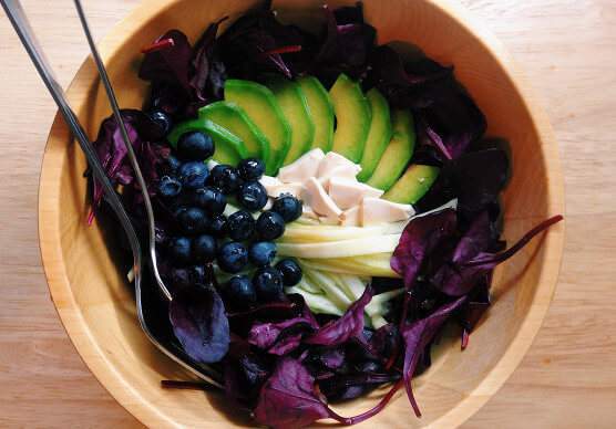 6. Выложите на дно салатного блюда свекольную ботву, с одной стороны распределите ломтики авокадо, с другой – ягоды черники, по центру положите сыр с кабачками.