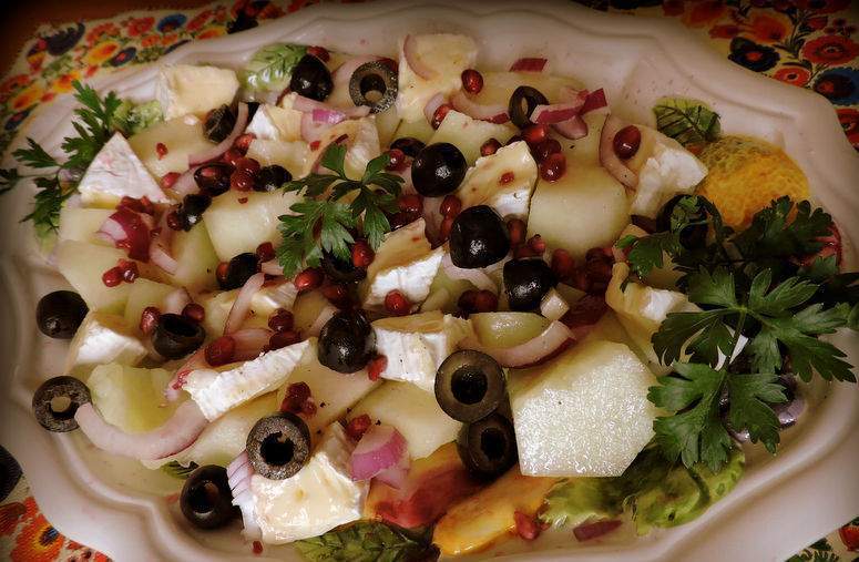 8. Салат с дыней в средиземноморском стиле полейте соусом, украсьте зеленью петрушки и немедленно подайте к столу.