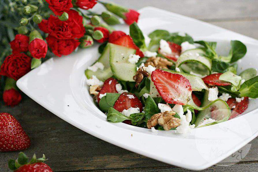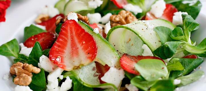 4. Клубнику вымойте, удалите чашелистики. Молодой огурец с нежной кожицей вымойте, не очищайте. Клубнику и огурец нарежьте тонкими ломтиками и разложите на салате.