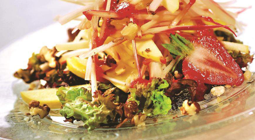 6. Возьмите блюдо для салата и выложите на него сначала салатные листья, поверх них дольки яблок в лимонном соке, сверху положите клубнику и ревень.