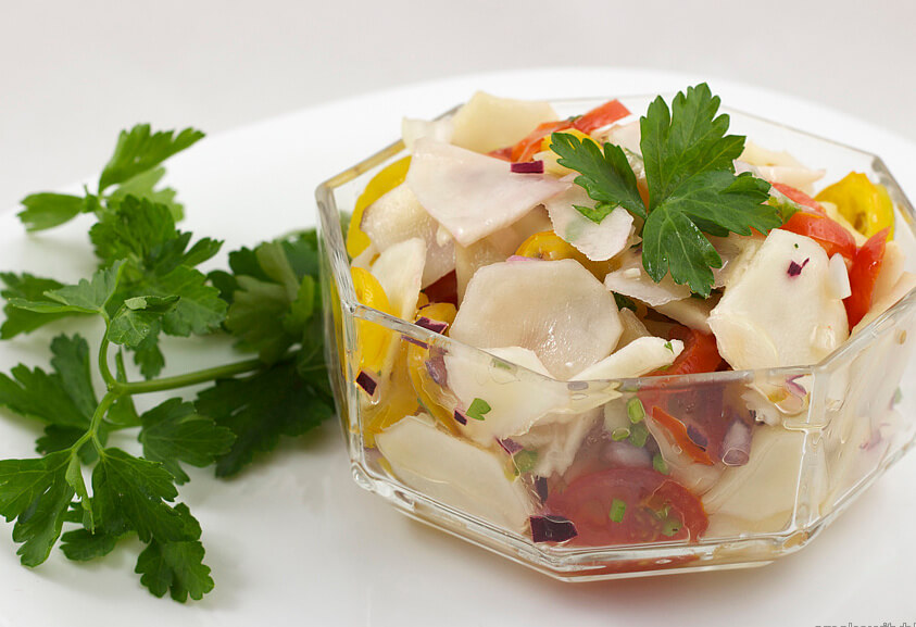 Если вы все еще не включили топинамбур в перечень продуктов для своего домашнего меню, стоит начать знакомство с этим овощем в осенне-зимнюю пору или весной, когда в земле выросли клубни, похожие на гофрированный картофель. Предлагаем вашему вниманию рецепт вкусного овощного салата из топинамбура.