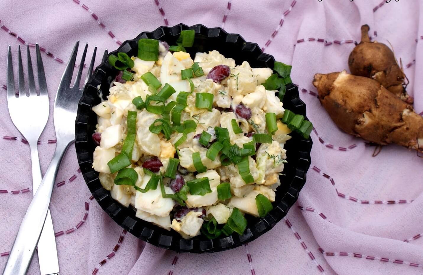 Салат из топинамбура с фасолью, яйцами и огурцами