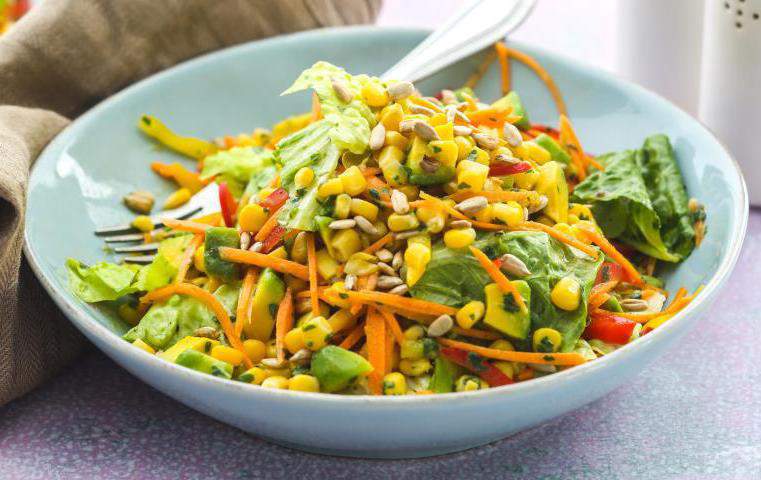 5. Высыпьте в салатную миску кукурузу, перец и авокадо. Перед подачей полейте салат заправкой и посыпьте сверху семечками.