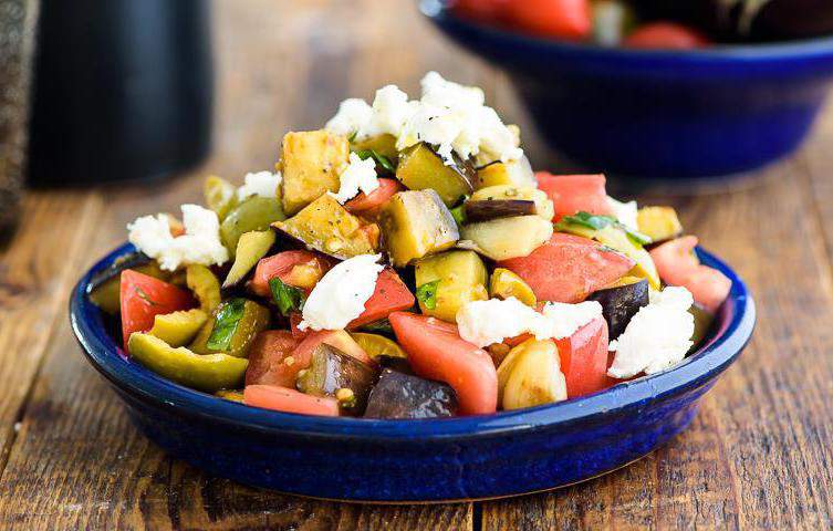 7. Раскрошите брынзу и посыпьте ею сверху салат. Салат из запеченных баклажанов с помидорами готов к подаче.