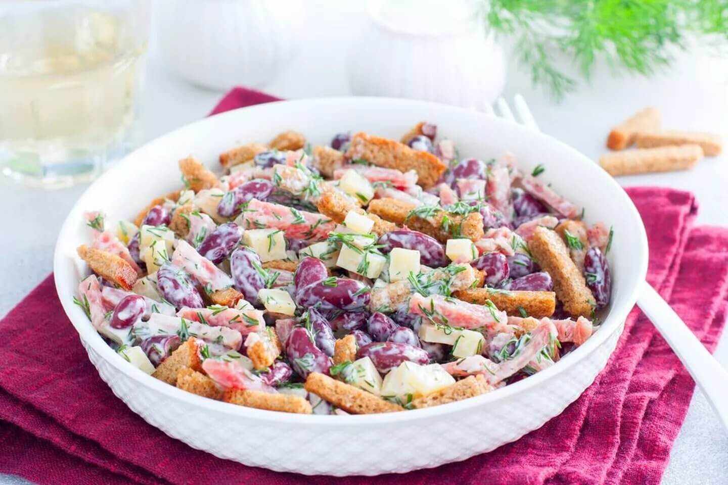 6.Перед подачей добавьте в миску сухарики, заправьте майонезом, добавьте соль по вкусу и перемешайте. Немецкий праздничный салат с фасолью и колбасой готов. Подавайте его к столу сразу после приготовления, иначе сухарики утратят хрустящие свойства.