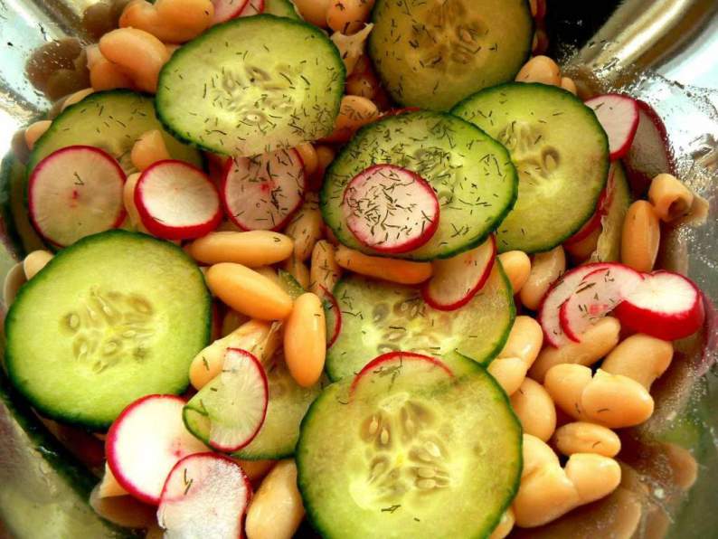 6. Салат из белой фасоли с редисом и огурцами не только вкусный, но и полезный. Подавайте его в дополнение к мясным или рыбным блюдам, а в жару – как самостоятельную закуску