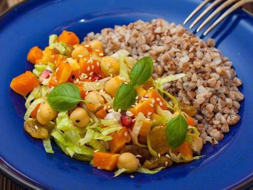 9. Добавьте к салату нут, запеченную тыкву, изюм. Сверху посыпьте салат поджаренным кунжутом и полейте приготовленным соусом. Подавайте салат с гречкой или другим гарниром на ваш вкус.