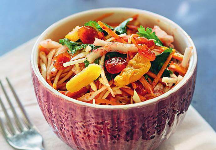 7. Смешайте капусту с листочками кинзы, посолите по вкусу и помните руками. Добавьте в салат сухофрукты с морковью и клюквенным соусом.