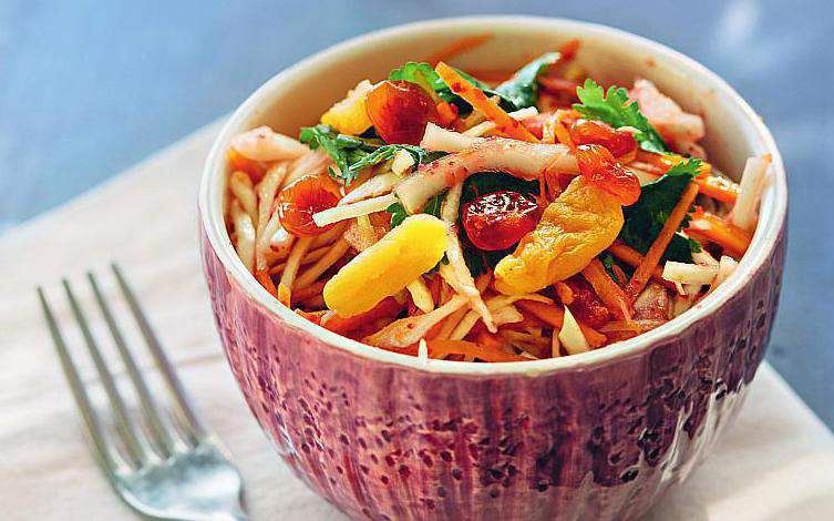 7.Постный салат с капустой и сухофруктами допустимо хранить в холодильнике около 5 дней.