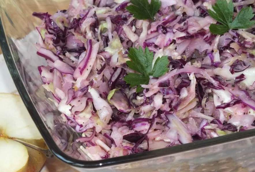 4. Добавьте остывший лук и яблоко в миску с капустой, влейте туда оставшееся растительное масло, бальзамический уксус. Добавьте прованские травы, майоран. Приправьте пряным перцем и солью, если вам покажется ее мало.