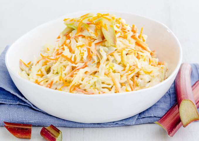 7. Добавьте в миску с капустой ревень, полейте салат заправкой и перемешайте. Оставьте салат с капустой и ревенем на 15 минут в холодильнике, затем подавайте к столу.