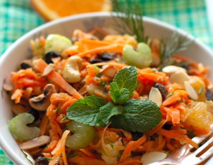 3.В глубокую миску сложите тертую морковь, чернослив, изюм, сельдерей, мелко нарезанные апельсиновые дольки и орешки, слегка поджаренные на сковороде.