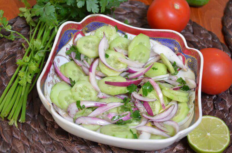 5. Полученным соусом залейте овощи в салатнике, тщательно перемешайте. Салат из огурцов с красным луком готов к подаче на стол. Но лучше подать его через 30-60 минут. Тогда сок лайма лучше пропитает овощи, придавая