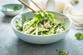 Салат из огурцов в азиатском стиле готовится быстро, но имеет замечательный вкус благодаря добавлению красного лука, имбиря и пикантной заправки из оливкового и кунжутного масла, соевого соуса и сока лайма. Салат отлично сочетается с запеченным мясом, поэтому его можно рекомендовать в качестве дополнения к блюдам на гриле. Его освежающий вкус вызывает приятные ощущения во рту и возбуждает аппетит. А еще салат готовится без особых трудозатрат и более чем доступен по цене входящих продуктов.