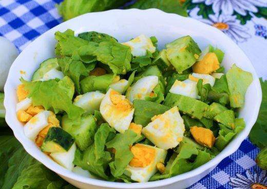4. Выложите в салатное блюдо вареные яйца, огурцы и салатные листья, приправьте салат солью и перцем по вкусу.