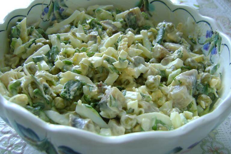 6.Тщательно перемешайте готовый салат с яйцом и огурцом и подайте к столу в дополнение к мясным блюдам, гарнирам или в качестве самостоятельной закуски.