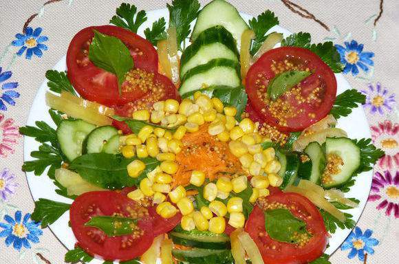8. В конце не забудьте про кукурузу, выложите ее на салат, добавив таким образом ему еще и жёлтого оттенка.