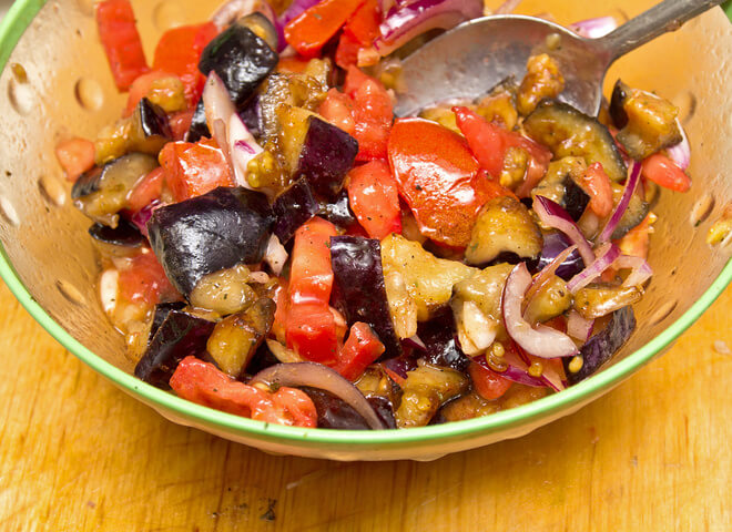 Предлагаем простой рецепт летнего салата из баклажанов с помидорами и сладким перцем, который особенно оценят любители постной или вегетарианской кухни. В летне-осеннюю пору салат позволит сполна насладиться вкусными и полезными огородными дарами, а в любое другое время – напомнит о солнечном лете.
