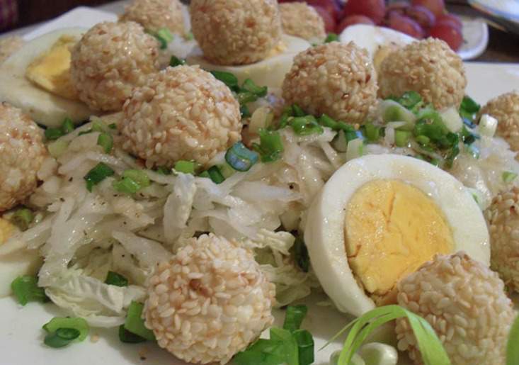6.На блюдо выложите измельченную капусту, на нее – дайкон, посыпьте зеленым луком и поперчите. Сверху разложите сырные шарики и яйца, нарезанные колечками.