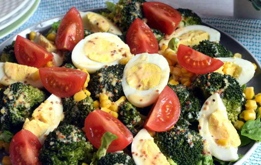 Даже если вы до сих пор не слишком уж любили брокколи, в сочетании с яйцами, овощами, зеленью и ароматным пикантным соусом этот вкусный полезный овощ вам понравится. Предлагаем вашему вниманию простой рецепт салата из брокколи с яйцами и кукурузой для будничной трапезы и для праздничного угощения.