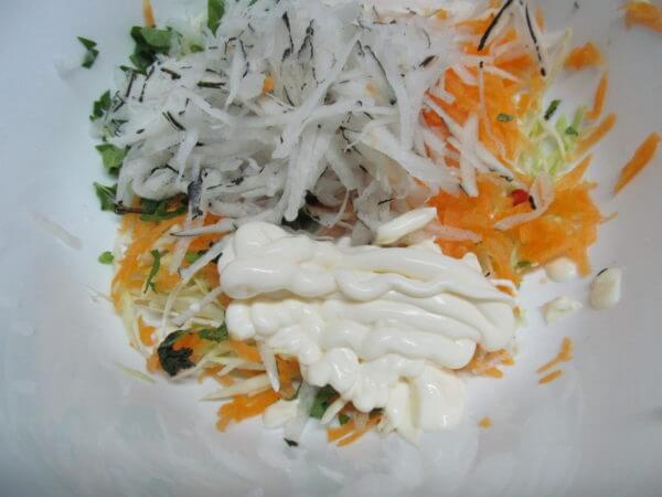3.Морковь очистите от кожуры, вымойте, натрите на крупную терку и добавьте в миску с остальными ингредиентами вместе с измельченной зеленью. Воду с редьки слейте, ополосните, хорошо отожмите и добавьте в салат.