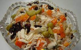 Сухофрукти, додані в овочевий салат, нададуть йому особливого, вишуканого відтінку смаку. З сухофруктів пропонується використовувати курагу, родзинки, сушені вишні, які замочуються в гарячому жасминовому чаї. Соус із гранатового соку, апельсинового соку, оливкової олії та часнику додасть смаку салату вишуканий шарм.