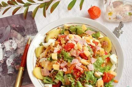 7. Нарубите крупными кусками листья салата и добавьте их в миску с остальными ингредиентами, залейте салат соусом и хорошо перемешайте. Салат с овощами, сыром и дижонской горчицей готов к употреблению.
