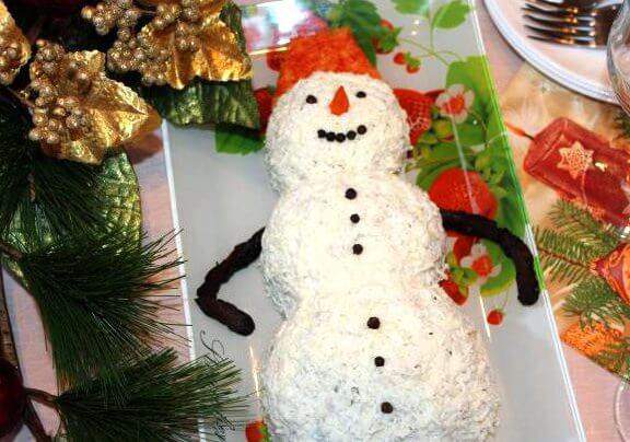 Оформление блюд в виде снеговиков очень популярно для зимних праздников. Такие забавные блюда всегда радуют взрослых и детей, создавая веселое сказочное настроение. Предлагаем вашему вниманию рецепт овощного салата «Снеговик» с грибами и орехами, как атрибут новогоднего праздника и хорошую закуску.