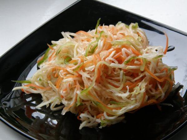 5.Салат з кореневої селери, моркви та огірка подавайте до столу на порційних тарілках чи в загальному салатнику відразу після заправки олією. Як бачите, готується салат швидко, якщо не враховувати настоювання у холодильнику.