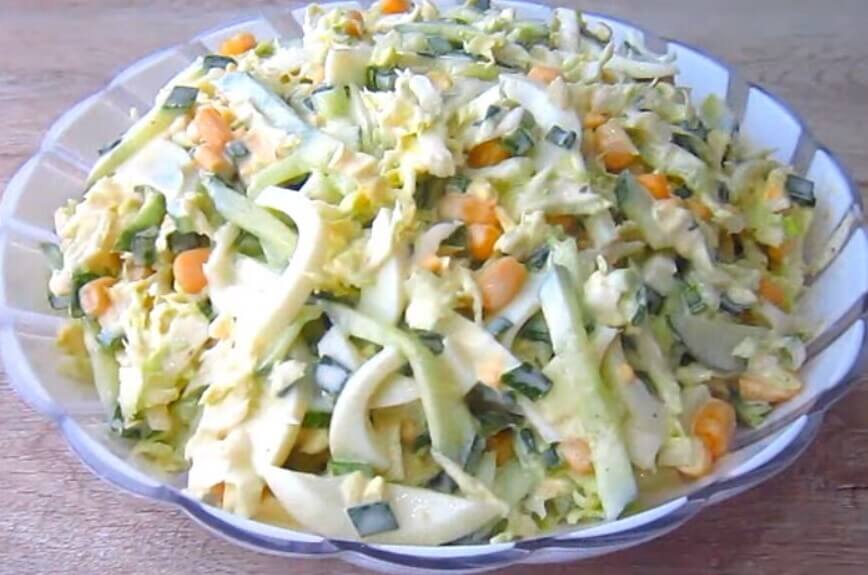 Салат з пекінської капусти, огірків, яєць та кукурудзи підійде для сімейної трапези як весняна вітамінна закуска. Рецептом передбачено заправляти салат майонезом (від перевіреного виробника чи домашнього виготовлення), але для надання дієтичних властивостей можете замінити його сметаною з додаванням невеликої кількості гірчиці.